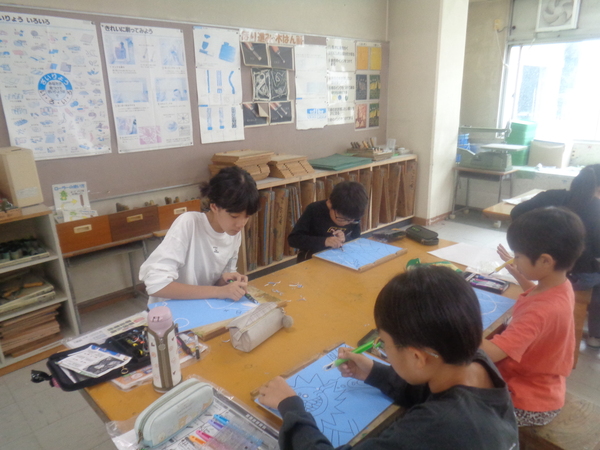 図工室では5年生が、教室では4年生が図工の学習で版画に取り組んでいました。