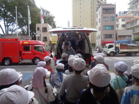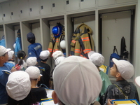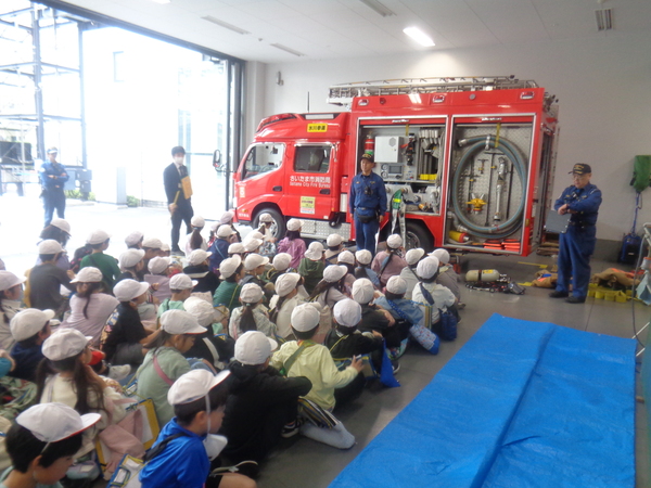 前半・後半組に分かれ、大宮消防署氷川参道出張所まで徒歩で行き、消防署の中や車両、道具などを見て、消防士さんに質問をすることができました。