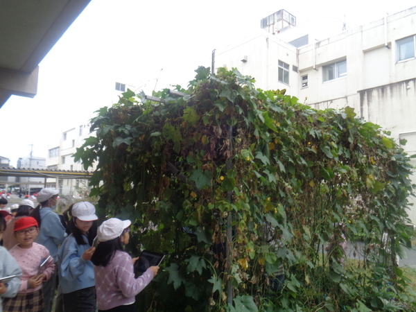茶色くなった葉やヘチマの様子を見て驚いていました。