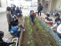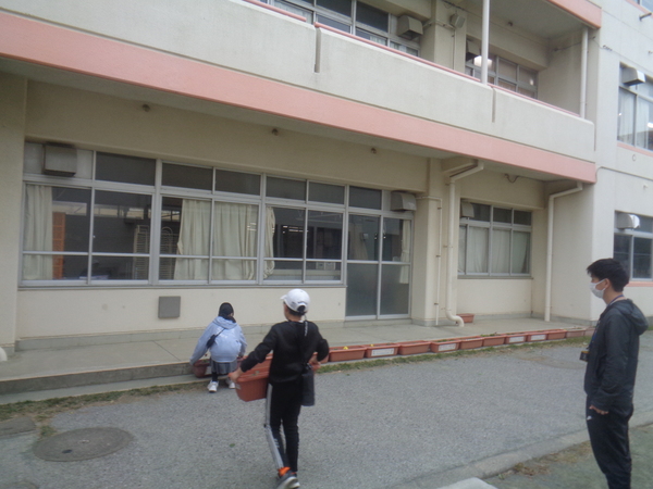 校庭や中庭では、環境委員会が植物の世話をしたり、植木鉢を運んだりして校内を美しくしていました。
