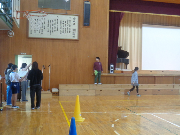体育館では、代表委員会が音楽会の司会練習をしていました。
