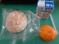 今日のメニューは、メロンパン、みかん、牛乳です。