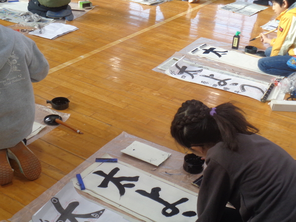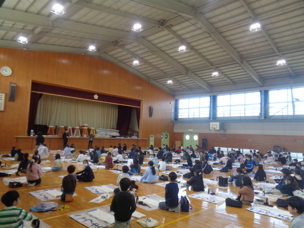3年生は体育館での初めての競書会でしたが、先生の話をしっかり聞いて、お手本をしっかり見て字を書いていました。