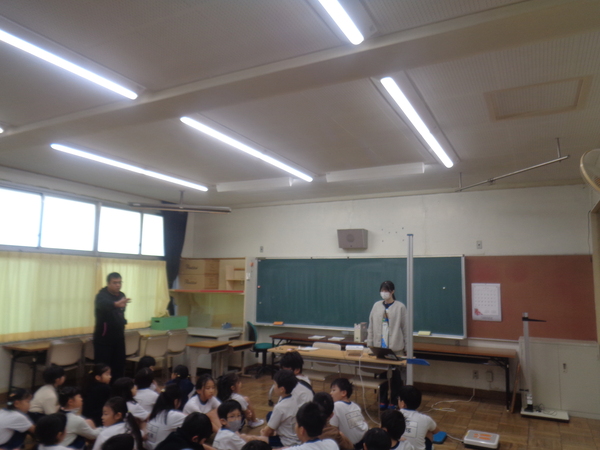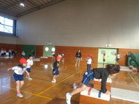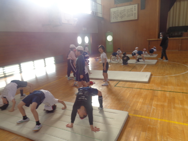 体育館では、1・2年生が体育をしており、跳び箱やマット運動に楽しそうに取り組んでいました。