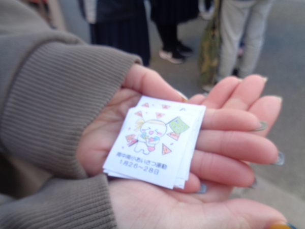 あいさつが上手な人には南小のあいさつマスコットが配られました。