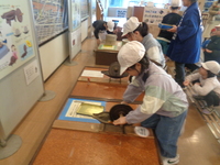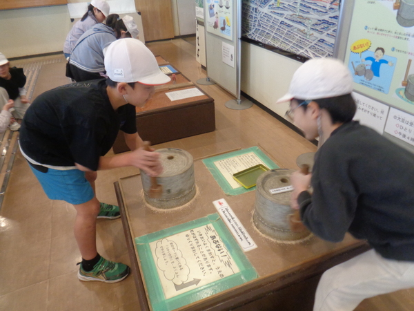 博物館では、あかりの道具の移り変わり、昔の農家の様子と昔のおもちゃ、石臼・薬研・竿ばかりのグループに分かれ、所員さんの説明を聞いたり、体験したりしました。