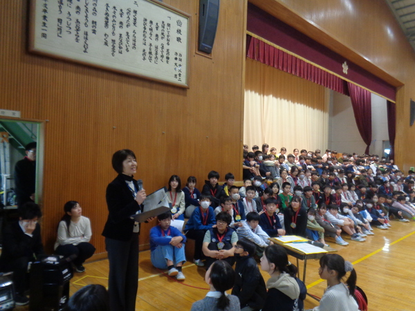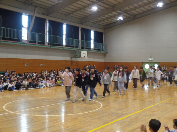 また、6年生は、先日プレゼントされたメダルをつけて入場し、全学年へ言葉を伝えたり、歌を歌ったりしていました。